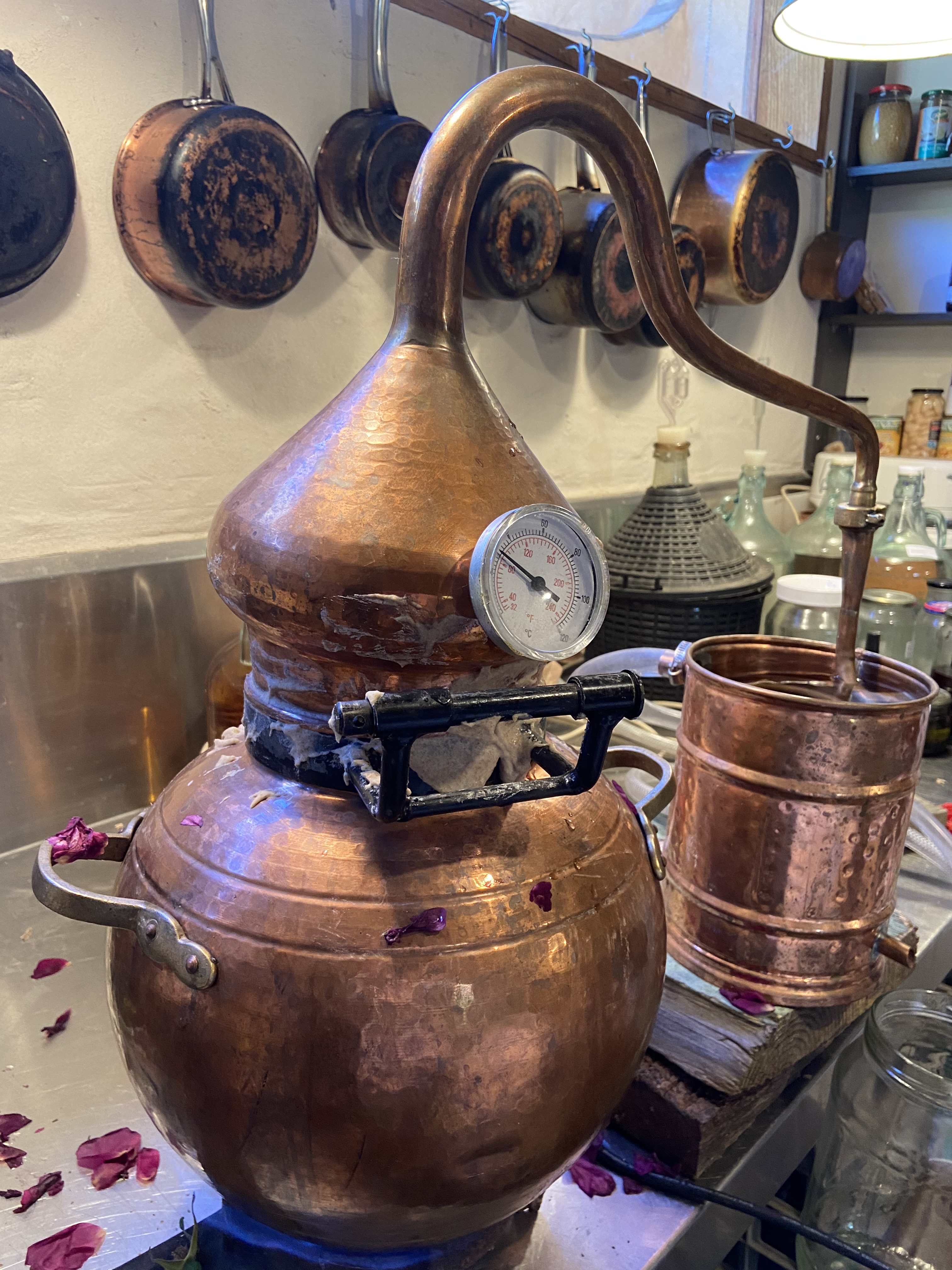 A physic garden, a digital art studio, a chefs kitchen and pantry, and an alchemical laboratory in a hidden valleyAlembic still. Here producing rose hydrosol . We have limited amounts for sale.
